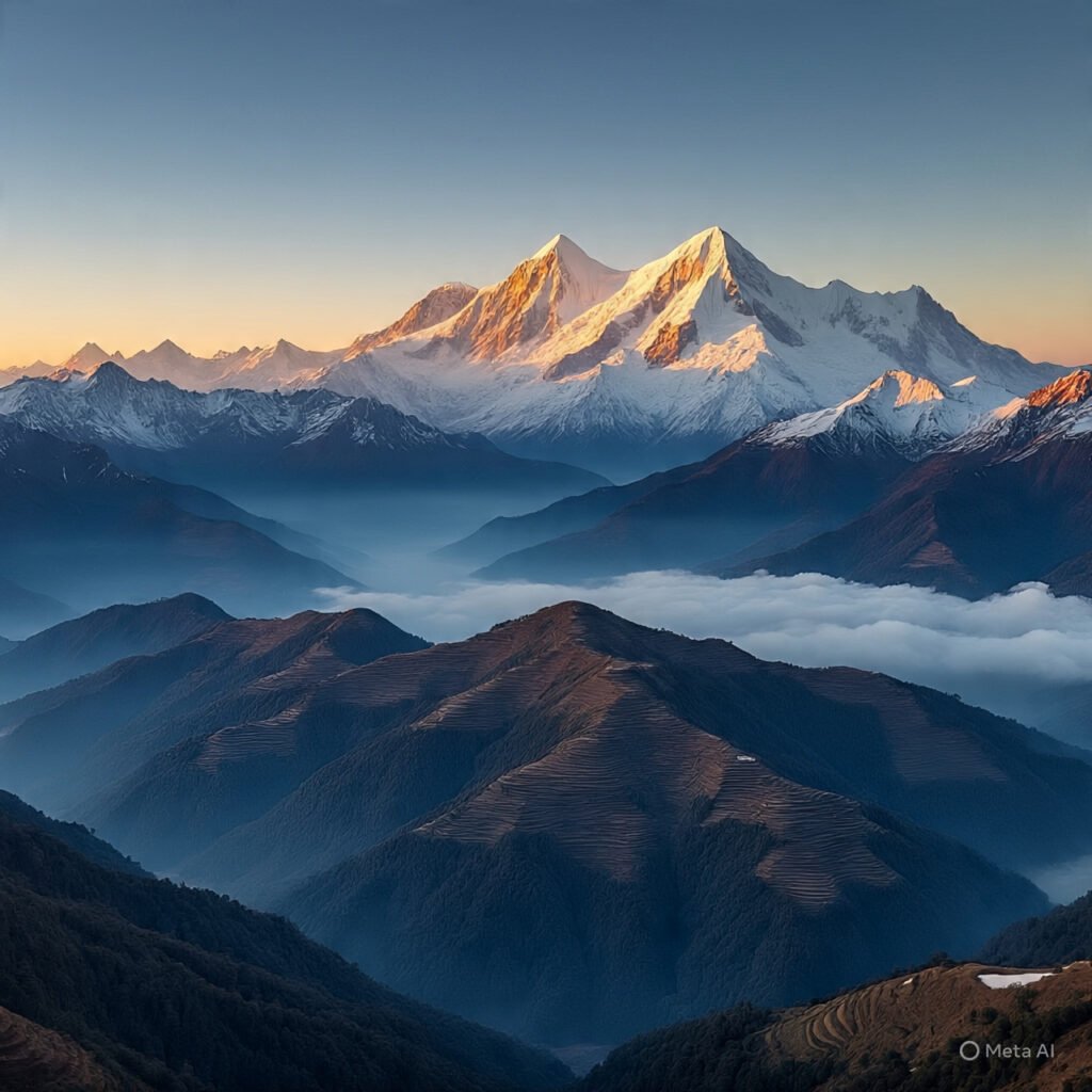 - ভোরে সূর্যোদয়ের সময় হিমালয়ের ওপর সোনালি রোদ পড়ার দৃশ্য
